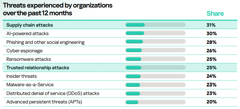 Supply chain and trusted relationship attacks are among the most common threats, yet the survey showed many leaders tend to underestimate them. When asked to classify threats by how dangerous they seemed, organizations focused on complex attacks like Advanced Persistent Threats (APTs), ransomware or insider threats, rather than the ones they actually face most often. Only 9% of businesses globally ranked supply chain attacks as their top concern, a strikingly low level of attention given how often these threats disrupt their operations. Similarly, just 8% named trusted relationship attacks.